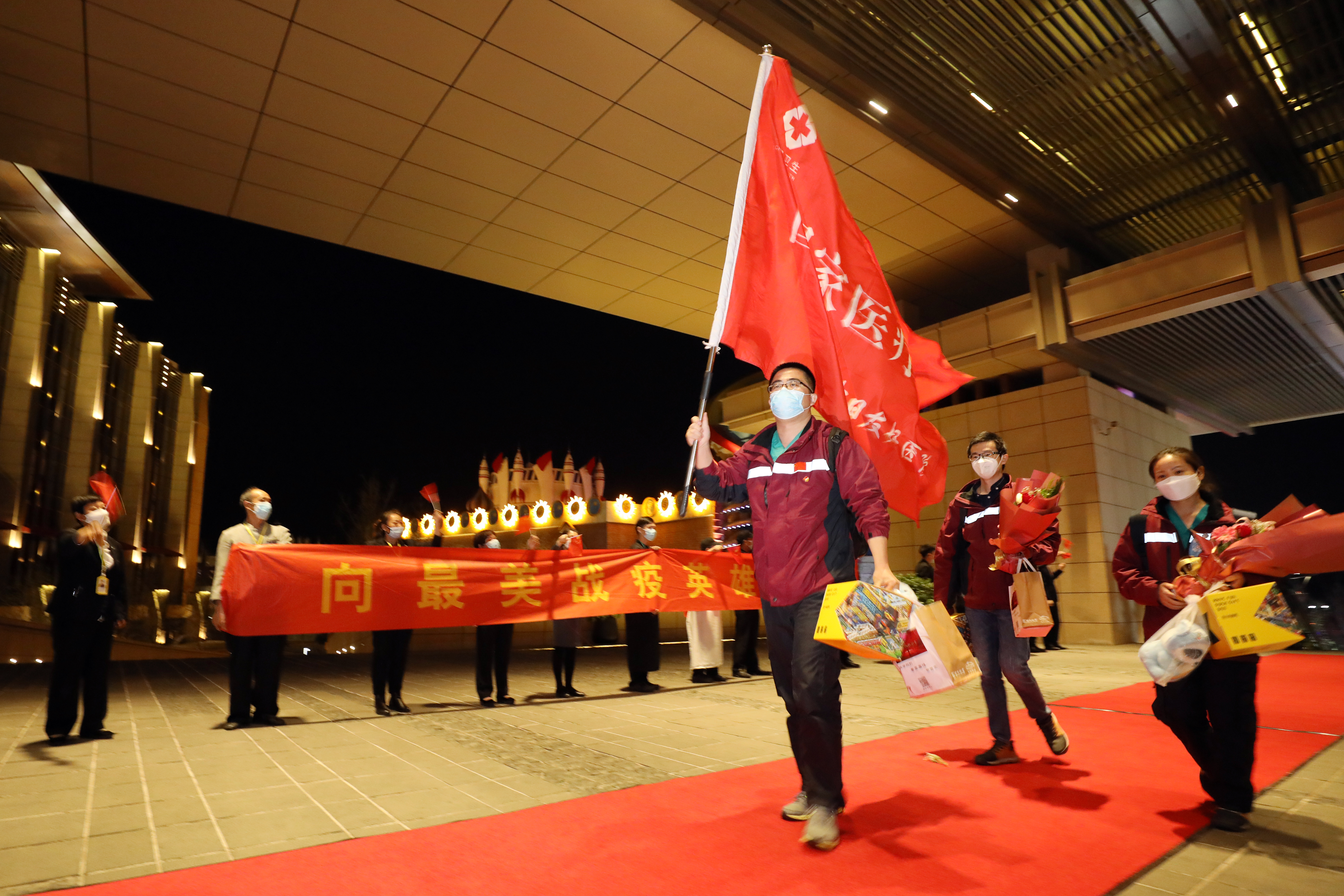在十五滿月的照耀和各類絢爛彩燈的映襯下,樂多港迎賓大道顯得格外莊嚴和熱鬧。由大小500多面鮮艷的五星紅旗組成的國旗通道、360多名各界干部群眾、奇幻樂園國際大馬戲迎賓馬隊、小龍人和演員方陣都翹首以盼,熱切等待著那激動人心的一刻。21時26分,國家援鄂醫療隊157名醫護人員和專家全部順利入住樂多港萬豪酒店,回到了他(她)們回京后的第一個“家”。